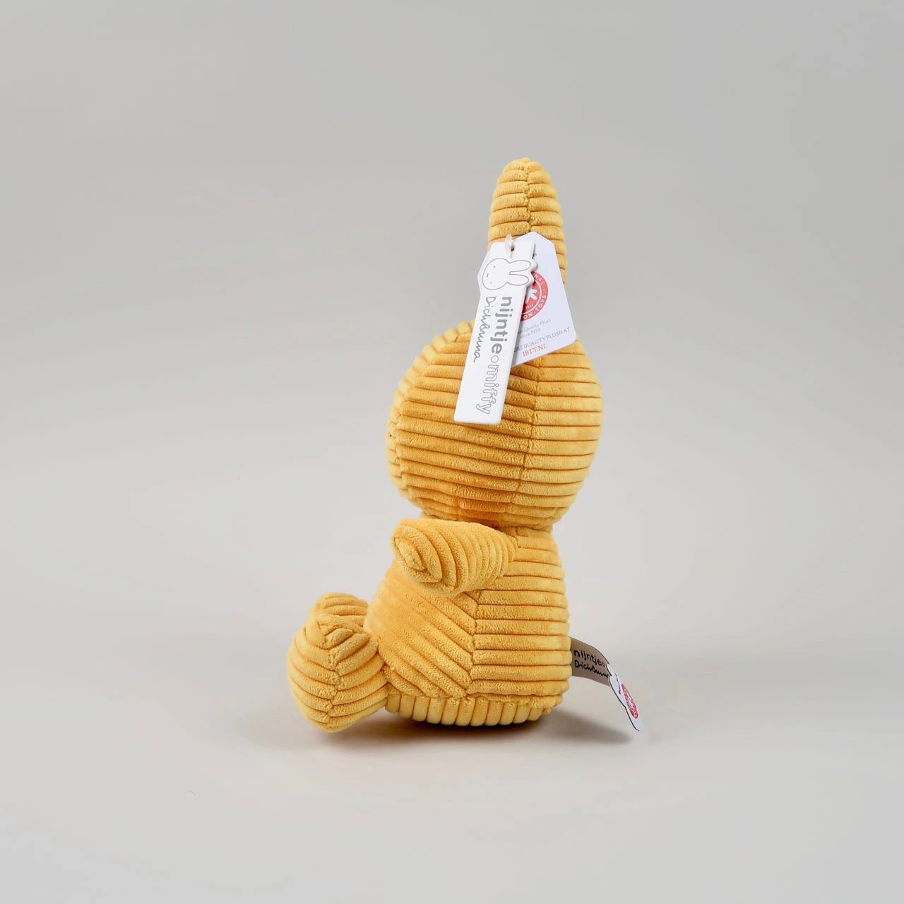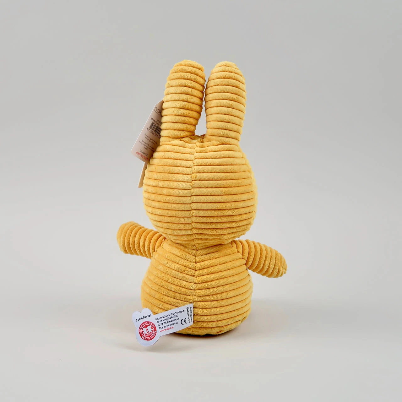 This soft toy is made from cord and sits proudly in an upright, or at least semi-upright, position. The eyes and mouth are stitched in black thread.